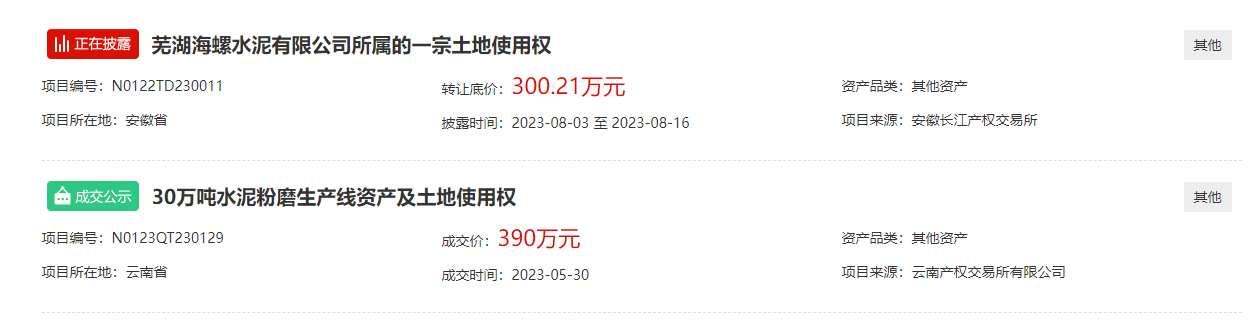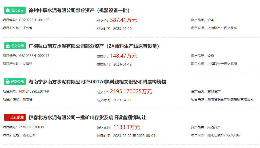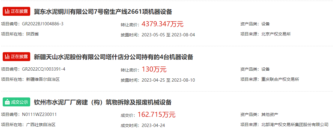 另有包含華潤(rùn)水泥、冀東水泥、萬(wàn)年青水泥在內(nèi)的4家品牌企業(yè)公開(kāi)出讓企業(yè)股權(quán);包含行業(yè)知名企業(yè)蕪湖海螺水泥在內(nèi)的兩家企業(yè)公開(kāi)出讓土地使用權(quán);包含天山水泥、中聯(lián)水泥、南方水泥、北方水泥、冀東水泥在內(nèi)的14家企業(yè)公開(kāi)出讓熟料生產(chǎn)線、熟料指標(biāo)、房屋建筑物、構(gòu)筑物及機(jī)器設(shè)備等資產(chǎn)。
