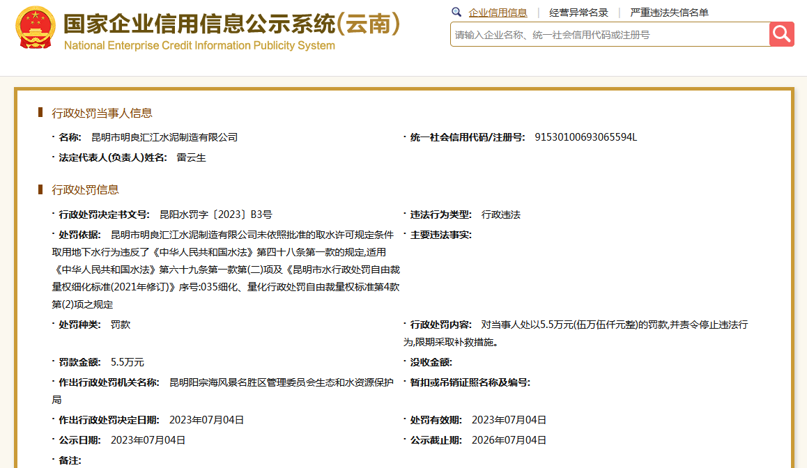 另外,根據(jù)國家企業(yè)信用信息公示系統(tǒng)公開信息顯示,昆明市明良匯江水泥制造有限公司未依照批準的取水許可規(guī)定條件取用地下水,被昆明陽宗海風(fēng)景名勝區(qū)管理委員會生態(tài)和水資源保護局處罰。
