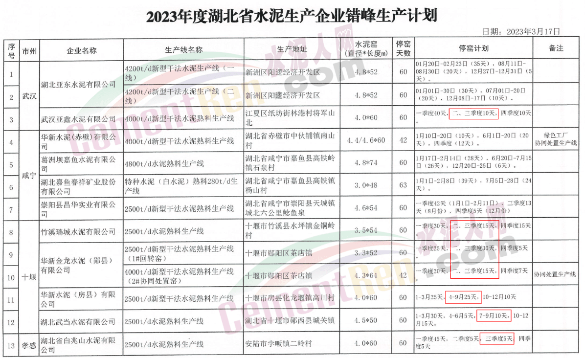 湖北省水泥生產(chǎn)企業(yè)2023年度錯峰生產(chǎn)計劃顯示,22家水泥企業(yè)23條熟料線三季度將涉及停窯限產(chǎn)。其中明確于9月份停窯限產(chǎn)的10家企業(yè)停窯時間從2天至18天不等。