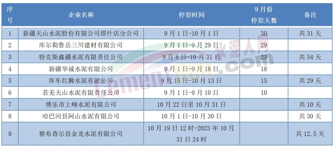 按照新疆工信廳年內(nèi)發(fā)布的七批水泥企業(yè)調(diào)整錯峰生產(chǎn)時間的公告,明確于9月內(nèi)停窯的6家企業(yè)停窯時間從10天~30天不等。明確9-10月份內(nèi)停窯的10家企業(yè),最長停窯54天。