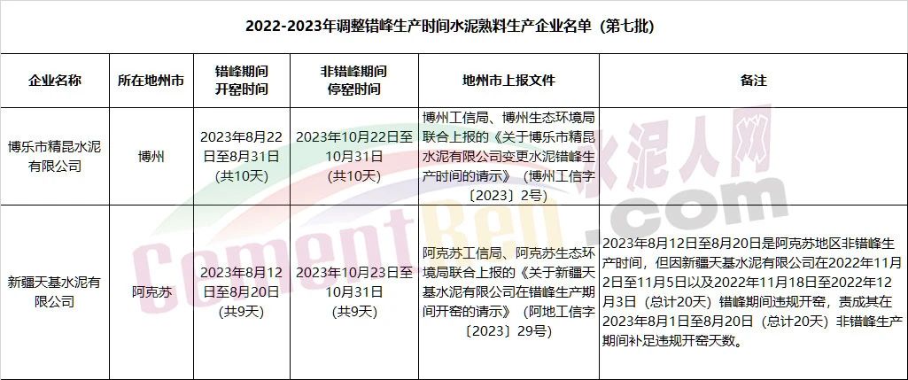 新疆工信廳近日發(fā)布的2022-2023年調(diào)整錯峰生產(chǎn)時間水泥熟料生產(chǎn)企業(yè)名單(第七批)顯示,博樂市精昆水泥有限公司將8月份錯峰期間停窯10天置換至非錯峰生產(chǎn)時間10月份停窯10天;新疆天基水泥有限公司將8月份停窯9天置換至10月份非錯峰生產(chǎn)時間停窯9天。