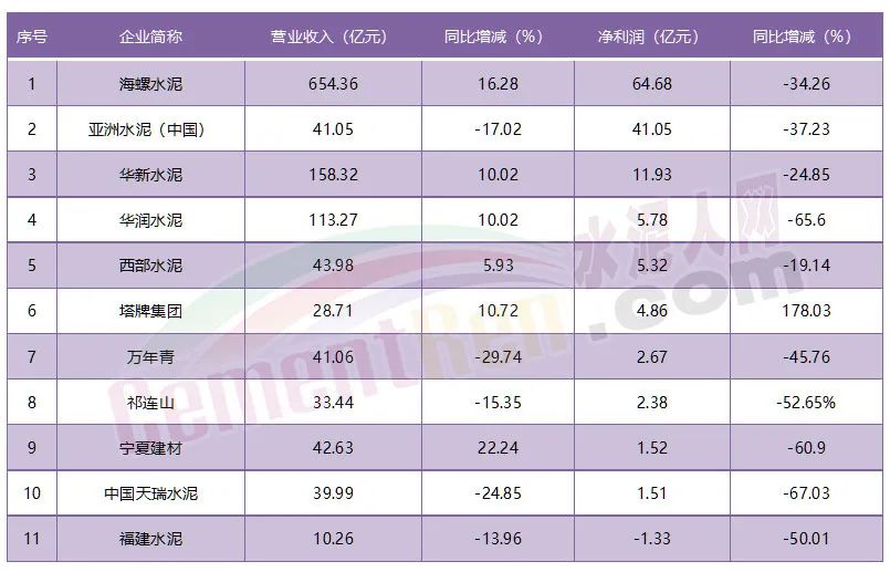 海螺水泥、亞洲水泥、華新水泥、華潤(rùn)水泥、西部水泥、萬年青寧、祁連山、寧夏建材、天瑞水泥等9家企業(yè)凈利潤(rùn)等均有不同程度的下滑;福建水泥虧損1.33億。