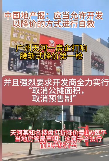 日前,廣州天河一知名樓盤打折降價(jià)賣1W每平,打響“腰斬式”降價(jià)第一槍。并且強(qiáng)烈要求開發(fā)商全力實(shí)行取消公攤面積,取消預(yù)售制。當(dāng)?shù)胤抗芫致暶鞣Q,這屬于合法行為,手續(xù)齊全。