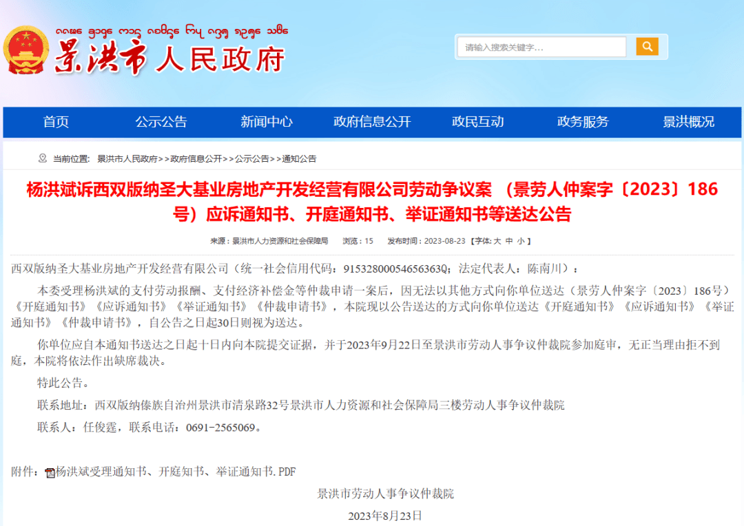 近日,景洪市人民政府發(fā)布公告,因楊洪斌的支付勞動報酬、支付經(jīng)濟補償金等仲裁申請一案無法以其他方式向西雙版納圣大基業(yè)房地產(chǎn)開發(fā)經(jīng)營有限公司送達《開庭通知書》《應訴通知書》《舉證通知書》《仲裁申請書》,景洪市勞動人事爭議仲裁院現(xiàn)以公告送達的方式該企業(yè)送達?! ?br />