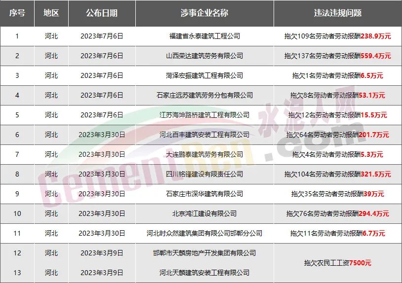 河北省13家房企、建企欠薪被通報或處罰,涉及金額1742萬元
