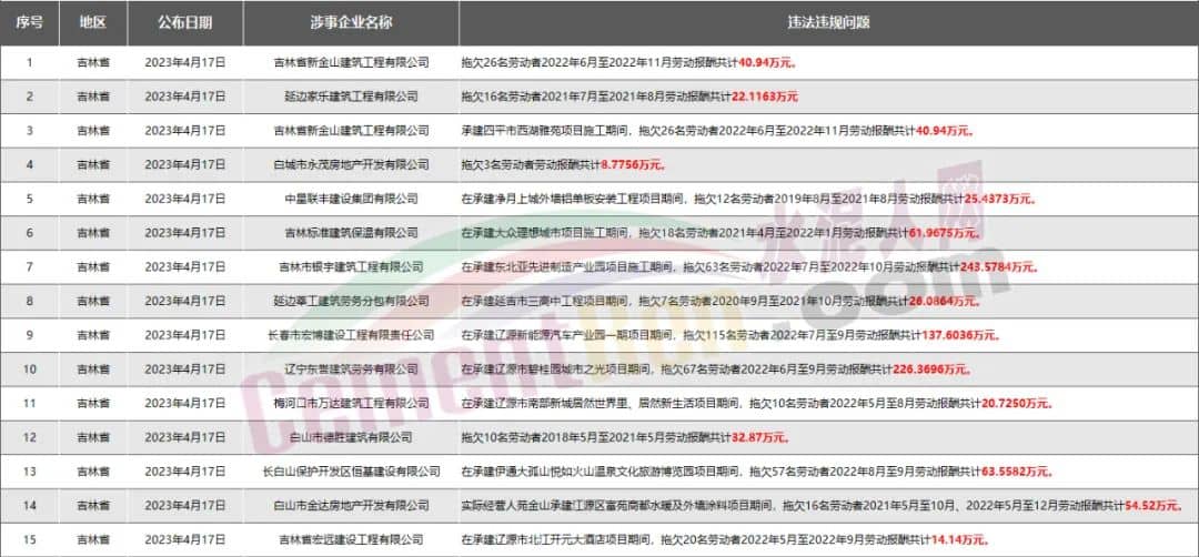 吉林省15家房企、建企欠薪被通報或處罰,涉及金額775.96萬元