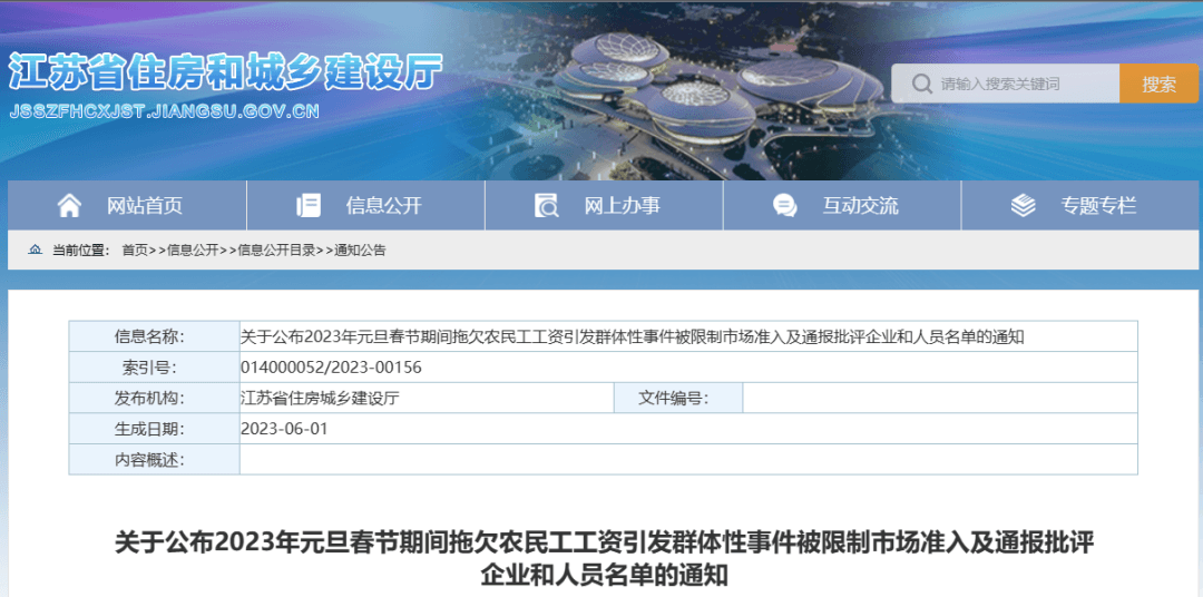 6月1日,江蘇省住房和城鄉(xiāng)建設廳公開消息,對2023年元旦春節(jié)期間因拖欠農(nóng)民工工資引發(fā)群體性事件的126家企業(yè)予以全省范圍內(nèi)限制建筑市場準入,對44家企業(yè)予以全省通報批評。
