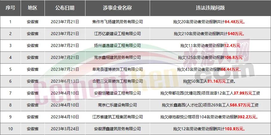 安徽省10家房企、建企欠薪被通報或處罰,涉及金額1944萬元