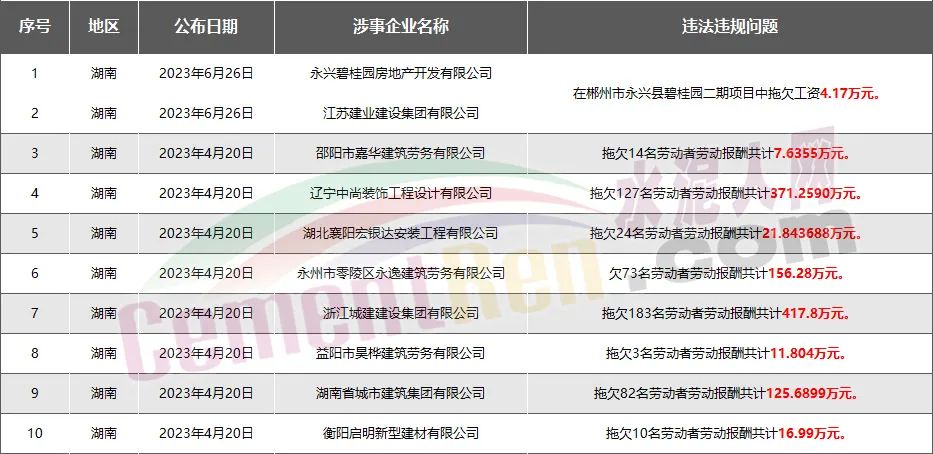 湖南省10家房企、建企欠薪被通報或處罰,涉及金額1133.44萬元