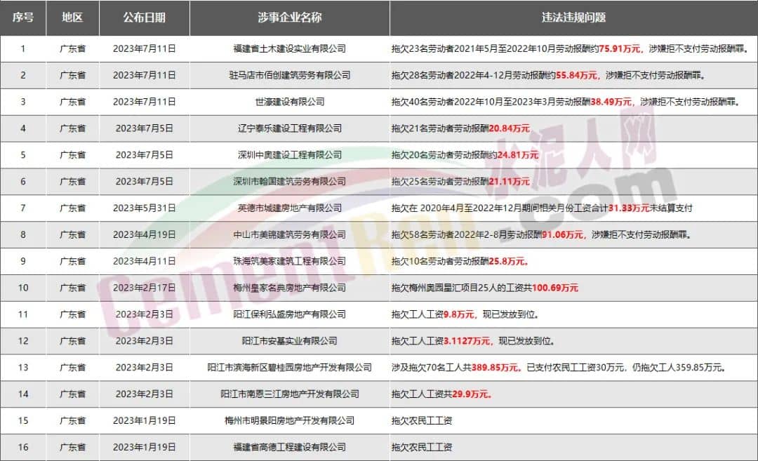 廣東省16家房企、建企欠薪被通報或處罰,涉及金額918.51萬元