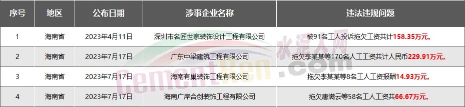 海南省4家房企、建企欠薪被通報或處罰,涉及金額469.86萬元