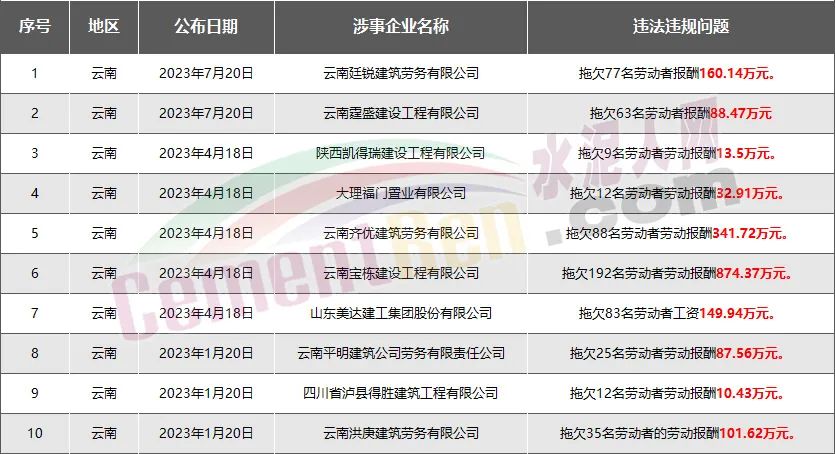 云南省10家房企、建企欠薪被通報或處罰,涉及金額1860.66萬元