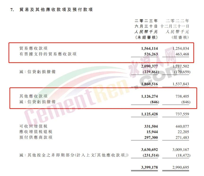 2023年上半年亞洲水泥應(yīng)收賬款5.6億,應(yīng)收票據(jù)8.05億,其他應(yīng)收款12.2億。