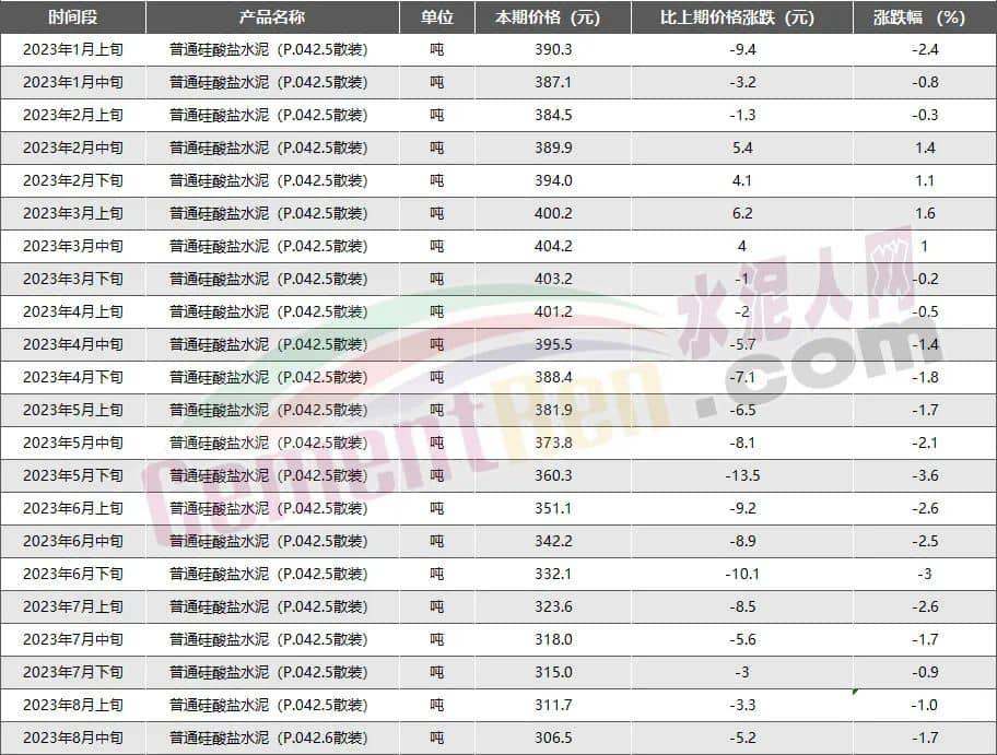 近日,國家統(tǒng)計局公布2023年8月中旬流通領域重要生產(chǎn)資料市場價格變動情況顯示,普通硅酸鹽水泥(P.O42.5散裝)水泥報價306.5元/噸,已是自3月下旬以來連續(xù)第15次價格下跌,且為自5月上旬以來第11次突破年內(nèi)最低價。