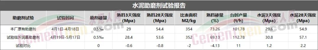 山東棗莊某水泥廠于4月1日—4月18日先試驗原有助磨劑,以其生產(chǎn)時間段為基數(shù),4月19日—5月17日時間段開始試驗應(yīng)用潤昌科技助磨劑,將兩段時間段進行對比。試驗結(jié)果如下所示: