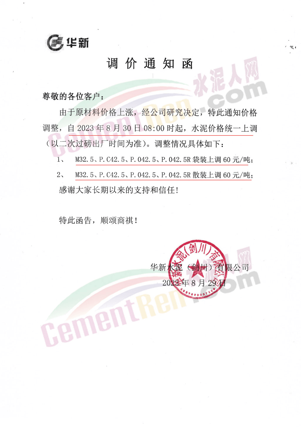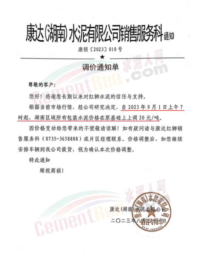 福建三明南方水泥有限公司通知,根據(jù)目前市場(chǎng)行情,經(jīng)公司研究決定,自2023年9月3日零時(shí)起公司各品種袋裝、散裝水泥出廠價(jià)在原有基礎(chǔ)上上調(diào)30元/噸。