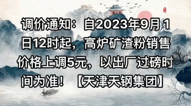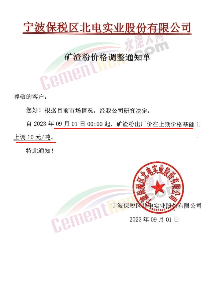 浙江寧波保稅區(qū)北電實業(yè)股份有限公司通知,根據(jù)目前市場情況,經(jīng)公司研究決定:自9月1日0時起,礦渣粉出廠價在上期價格基礎上上調(diào)10元/噸,上調(diào)后礦粉現(xiàn)金掛牌價210元/噸。