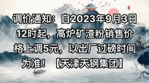 天津天鋼集團于9月1日和9月3日兩次通知上調(diào)高爐礦渣粉銷售價格,累計上調(diào)10元/噸,上調(diào)后S95散裝報價115元/噸。