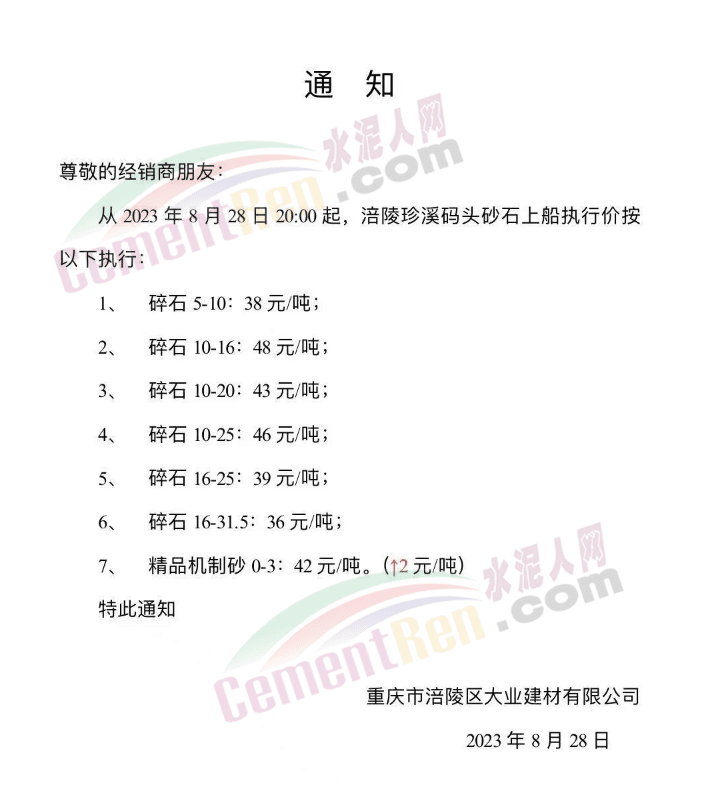 重慶市涪陵區(qū)大業(yè)建材通知,自2023年8月28日17點42分碎石(5-10、10-16、16-25)上調(diào)2元/噸,機制砂上調(diào)2元/噸。