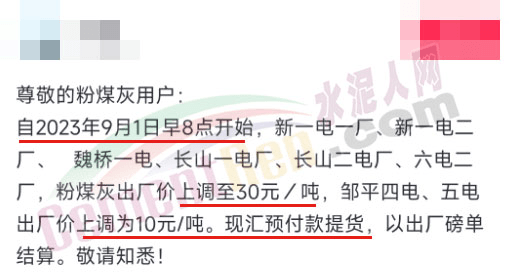 據(jù)山東貿(mào)易商通知,自2023年9月1日早8點開始,新一電一廠、新一電二魏橋一電、長山一電廠、長山二電廠、六電二廠,粉煤灰出廠價上調(diào)至30元/噸,鄒平四電、五電出廠價上調(diào)為10元/噸?,F(xiàn)匯預付款提貨,以出廠磅單結(jié)算。