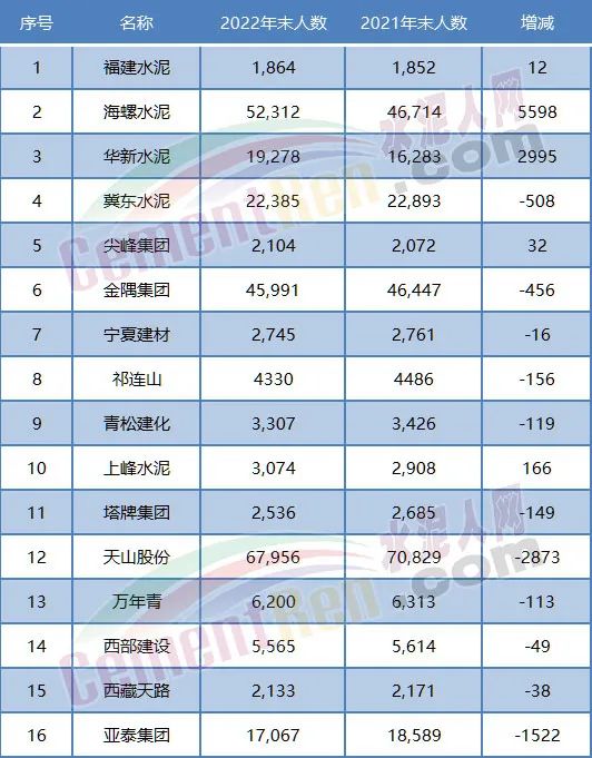 據(jù)不完全統(tǒng)計(jì),從2019~2022年金隅集團(tuán)、冀東水泥、亞泰集團(tuán)員工都有千人以上的減員,萬年青、祁連山、塔牌水泥均有百人以上的減員。2021~2022年金隅集團(tuán)、冀東水泥、萬年青、祁連山、塔牌集團(tuán)、青松建化等均有百人以上的減員,冀東水泥減員達(dá)500多人。然而,從水泥行業(yè)未來長遠(yuǎn)的發(fā)展來看,這才是剛剛開始。