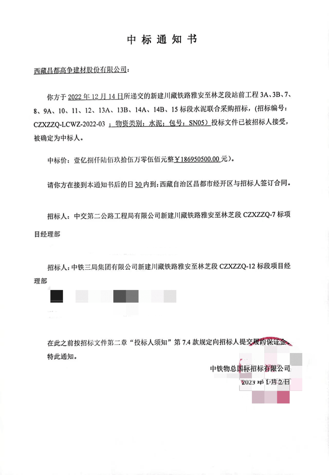 最終,在黨委書記、董事長(zhǎng)和領(lǐng)導(dǎo)班子的正確決策、大力支持和各部門的精誠(chéng)團(tuán)結(jié)、全力配合之下,昌都高爭(zhēng)憑借扎實(shí)的服務(wù)態(tài)度和良好的社會(huì)信譽(yù)在激烈的競(jìng)爭(zhēng)中脫穎而出,順利中標(biāo)川藏鐵路雅安至林芝段工程水泥采購(gòu)項(xiàng)目,成功獲得水泥供應(yīng)權(quán),中標(biāo)量28萬(wàn)噸,中標(biāo)金額約1.87億元。
