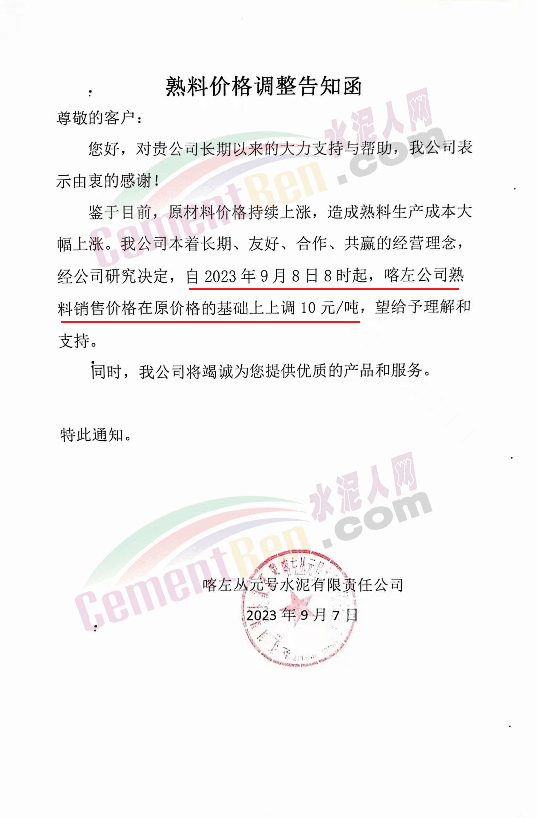 日前,遼寧喀左叢元號水泥有限責(zé)任公司通知,鑒于目前,原材料價格持續(xù)上漲,造成熟料生產(chǎn)成本大幅上漲。經(jīng)公司研究決定,自2023年9月15日8時起,喀左公司熟料銷售價格在原價格的基礎(chǔ)上上調(diào) 20 元/噸。據(jù)水泥人網(wǎng)此前消息,該企業(yè)曾于9月8日上調(diào)熟料報價10元/噸,兩次累計上調(diào)30元/噸。