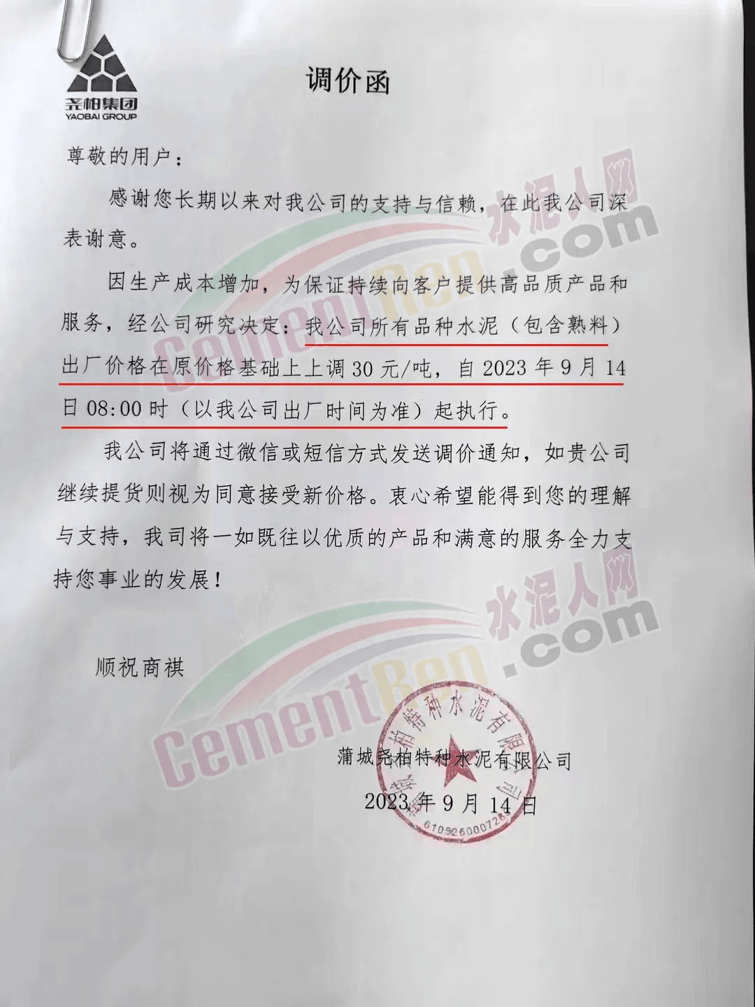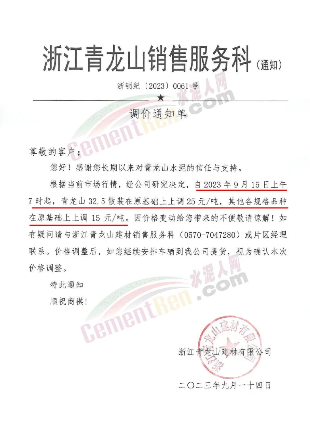 華新金龍水泥(鄖縣)有限公司通知,鑒于當前原材料價格上漲,及市場行情變化,公司決定于2023年9月14日起所有品種水泥價格上調(diào)30元/噸。