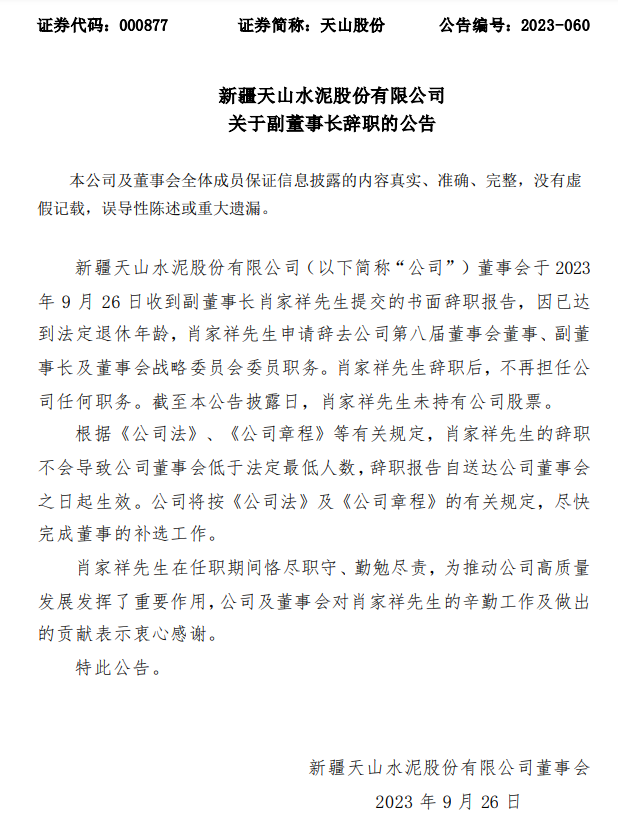 天山股份9月26日晚間發(fā)布公告稱,新疆天山水泥股份有限公司董事會(huì)于2023年9月26日收到副董事長(zhǎng)肖家祥先生提交的書面辭職報(bào)告,因已達(dá)到法定退休年齡,肖家祥先生申請(qǐng)辭去公司第八屆董事會(huì)董事、副董事長(zhǎng)及董事會(huì)戰(zhàn)略委員會(huì)委員職務(wù),不再擔(dān)任公司任何職務(wù)。