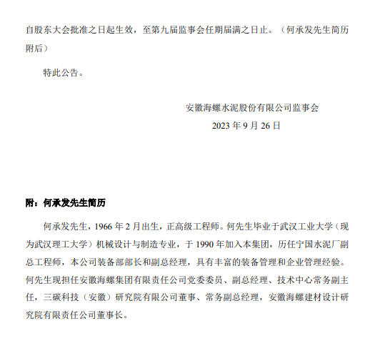 海螺水泥:監(jiān)事會(huì)主席吳小明辭職,何承發(fā)接任