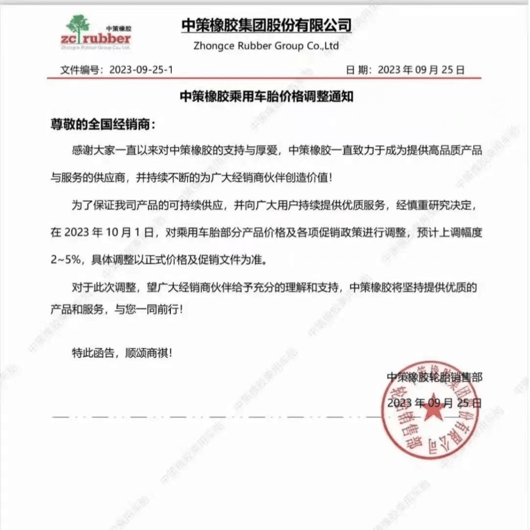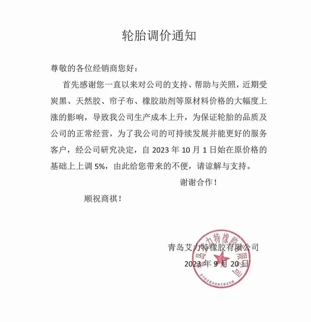 青島艾力特:自10月1日起,將輪胎價(jià)格在原價(jià)格的基礎(chǔ)上上調(diào)5%。