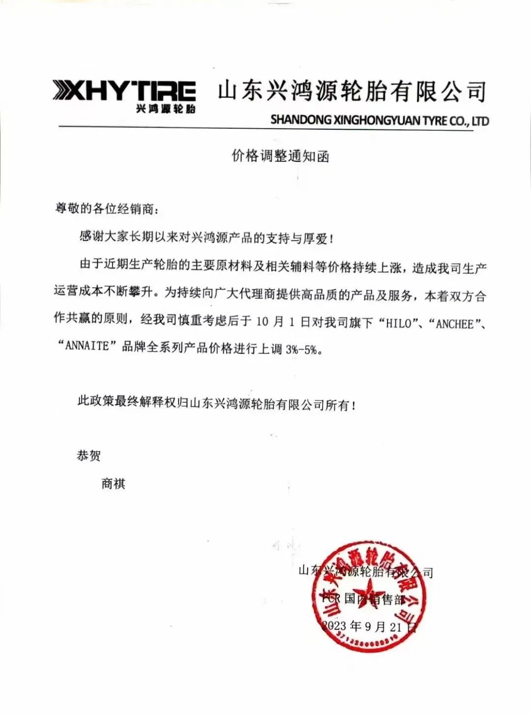 山東興鴻源輪胎:10月1日起,將對(duì)旗下“HILO”“ANCHEE”“ANNAITE”品牌全系列產(chǎn)品價(jià)格進(jìn)行上調(diào)3%—5%。