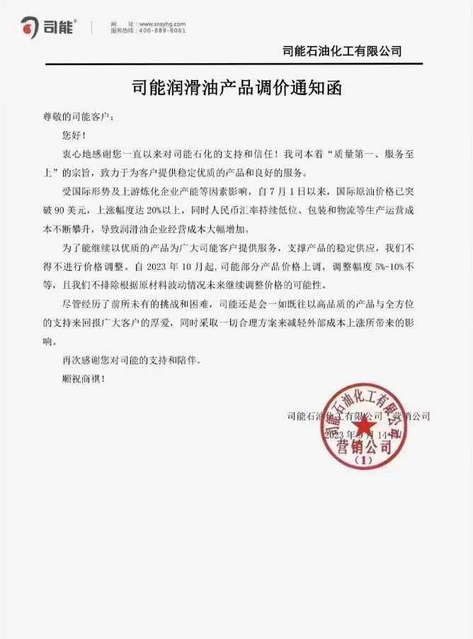 司能潤(rùn)滑油:自10月起,能部分產(chǎn)品價(jià)格上調(diào)5%—10%不等。