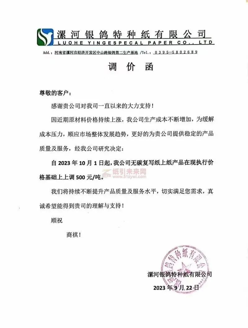 漯河銀鴿特種紙:自10月1日起無(wú)碳復(fù)寫(xiě)紙上紙產(chǎn)品在執(zhí)行價(jià)格基礎(chǔ)上上調(diào)500元/噸。