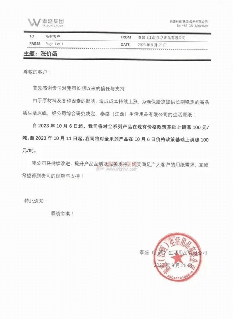金紅葉紙業(yè):受近期市場(chǎng)波動(dòng)等多種因素影響,我司決定對(duì)原紙價(jià)格做如下調(diào)整自2023年9月25日起所有區(qū)域原紙價(jià)格在目前基礎(chǔ)上調(diào)漲100元/噸,自2023年10月10日起所有區(qū)域原紙價(jià)格在25日基礎(chǔ)上再調(diào)漲200元/噸。