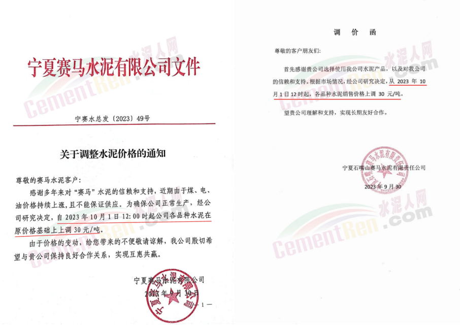 10月1日,寧夏賽馬水泥、寧夏吳忠賽馬,寧夏中衛(wèi)賽馬、寧夏石嘴山賽馬等企業(yè)陸續(xù)通知,各規(guī)格品種水泥在原基礎(chǔ)上上調(diào)30元/噸。