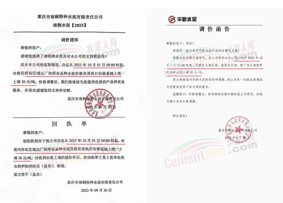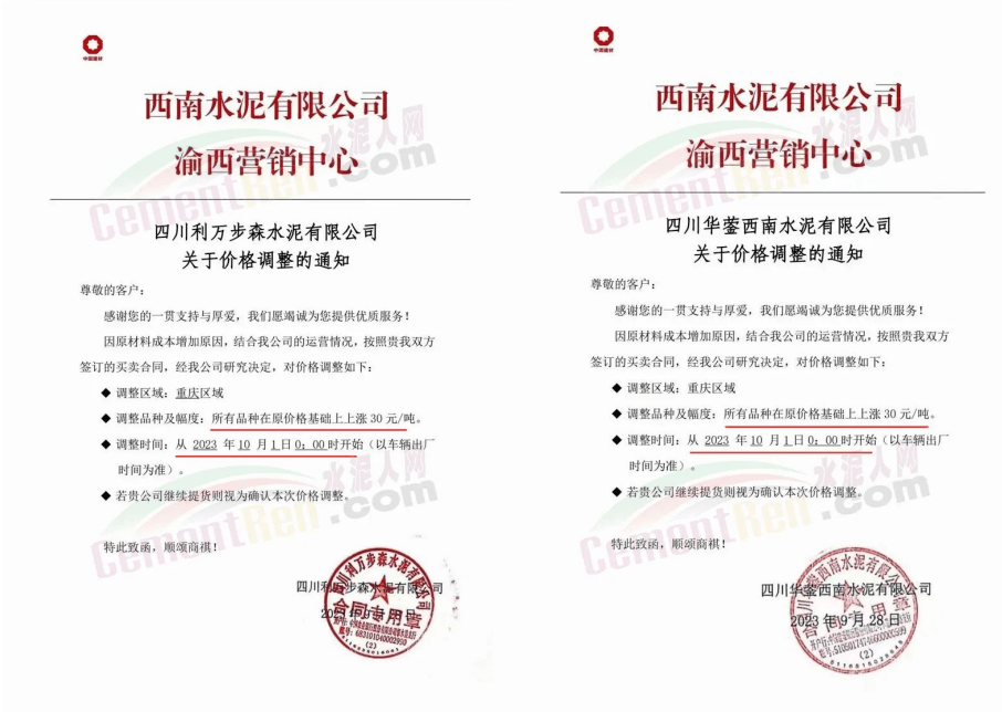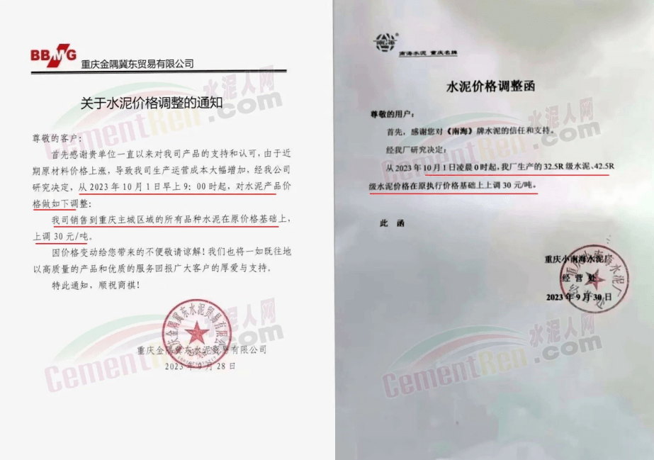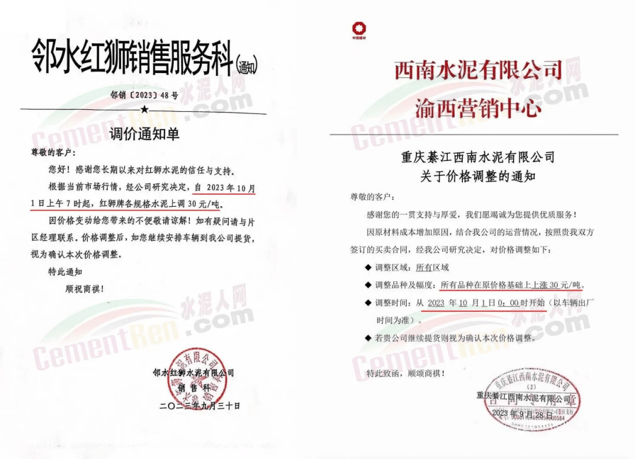 10月1日重慶金隅冀東、華新水泥、紅獅水泥、西南水泥渝西營(yíng)銷(xiāo)中心等主要品牌企業(yè)通知,上調(diào)水泥價(jià)格30元/噸。