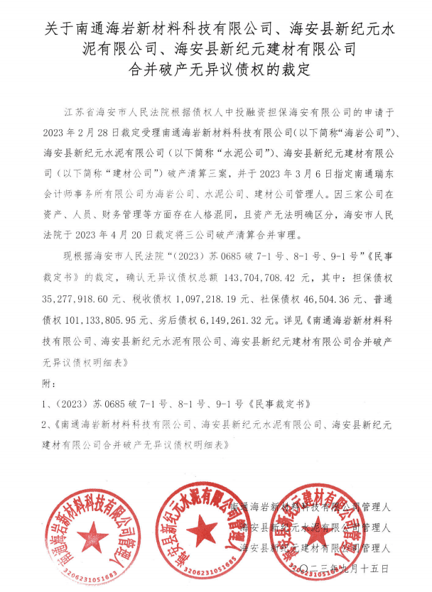 江蘇省海安市人民法院根據(jù)債權(quán)人中投融資擔保海安有限公司的申請,于2023年2月28日裁定受理南通海巖新材料科技有限公司、海安縣新紀元水泥有限公司、海安縣新紀元建材有限公司破產(chǎn)清算三案,并于2023年3月6日指定南通瑞東會計師事務(wù)所有限公司為海巖公司、新紀元水泥公司、建材公司管理人。因三家公司在資產(chǎn)、人員、財務(wù)管理等方面存在人格混同,且資產(chǎn)無法明確區(qū)分,海安市人民法院于2023年4月20日裁定將三公司破產(chǎn)清算合并審理。