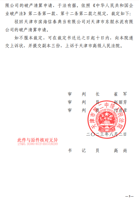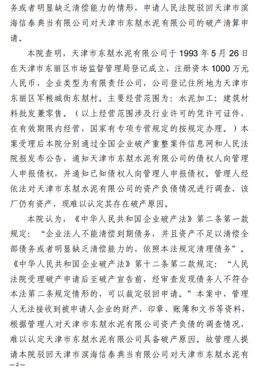 2023年7月21日,管理人向天津市第二中級人民法院提交申請稱,天津市東堼水泥有限公司相關(guān)人員下落不明,管理人未能接收到天津市東堼水泥有限公司的財產(chǎn)、印章、賬簿和文書等資料,經(jīng)管理人依法對天津市東堼水泥有限公司的資產(chǎn)負債情況進行調(diào)查,該廠仍有資產(chǎn),現(xiàn)難以認定其存在破產(chǎn)原因。法院于8月2日裁定駁回天津市濱海信泰典當有限公司對天津市東堼水泥有限公司的破產(chǎn)清算申請。