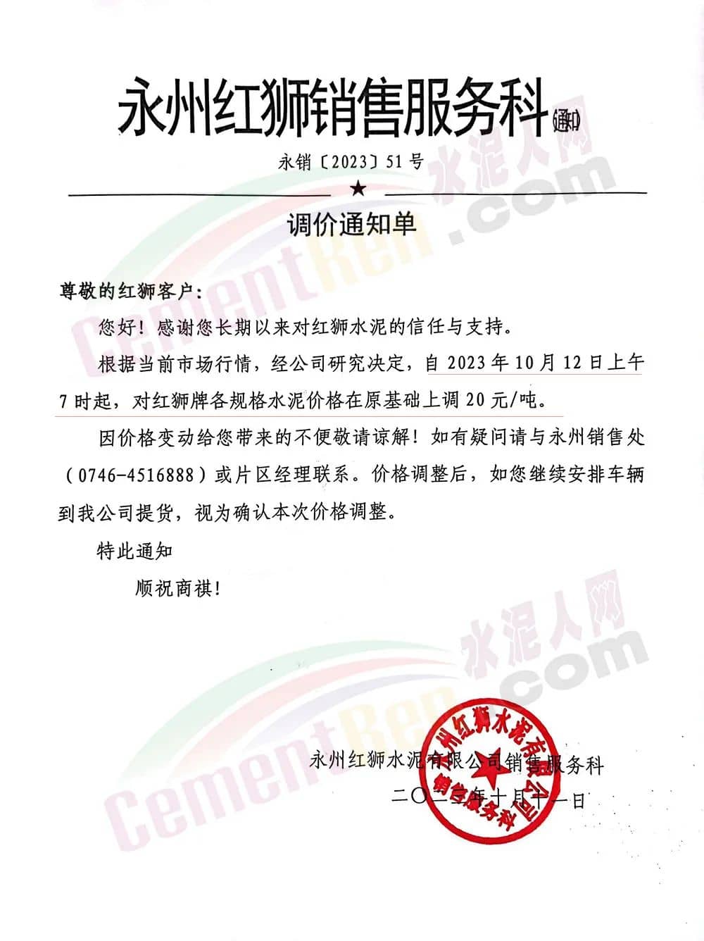 同日湖南區(qū)域主要品牌企業(yè)通知12日起再次上調(diào)水泥價(jià)格20元/噸。
