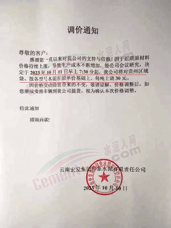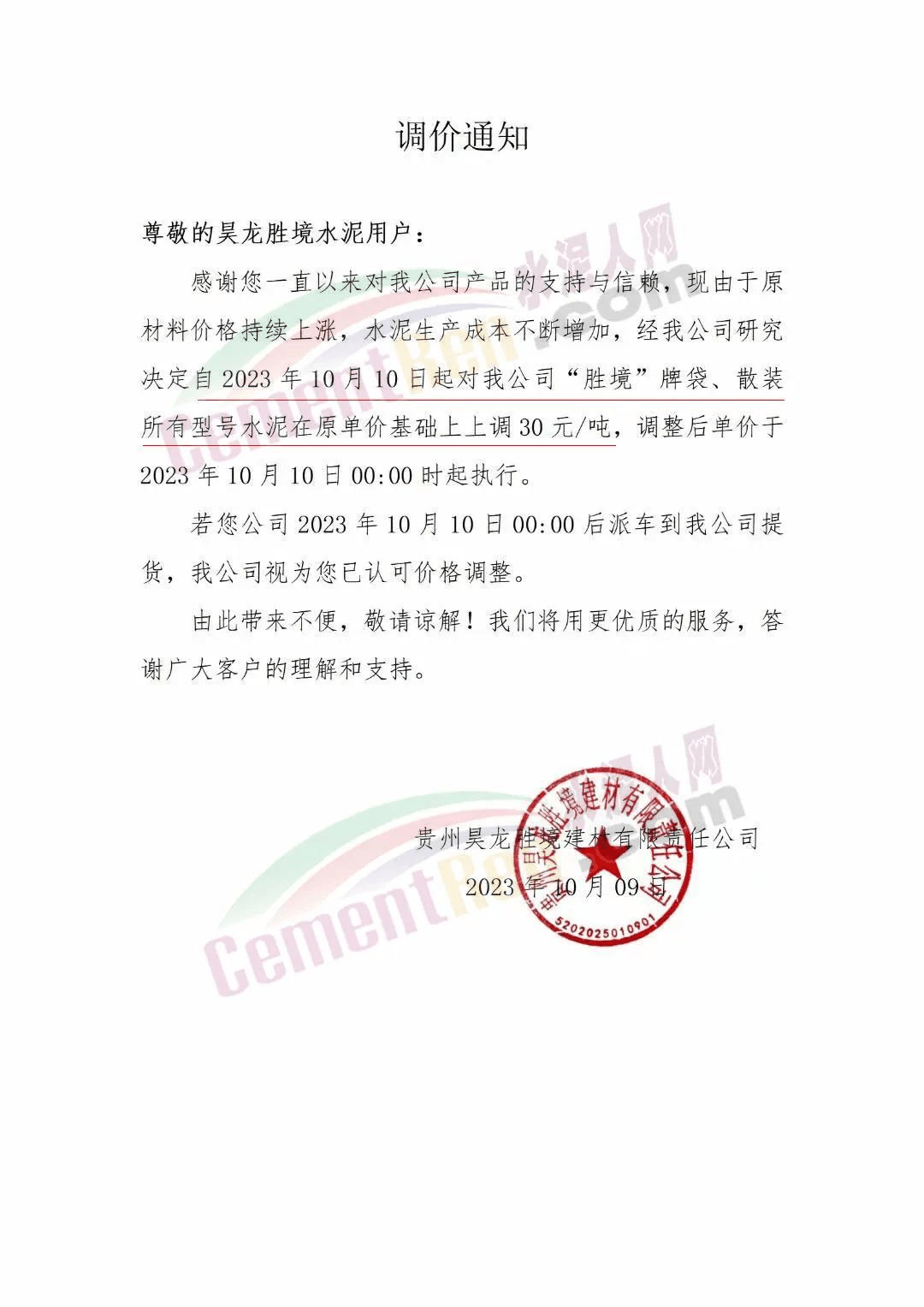 貴州區(qū)域多家企業(yè)通知上調(diào)水泥報(bào)價(jià)30元/噸。