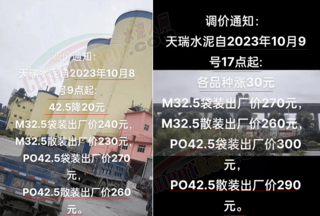 日前,河南地區(qū)主要品牌企業(yè)天瑞、中聯(lián)同力等通知上調(diào)報(bào)價(jià)30元/噸。當(dāng)?shù)亟?jīng)銷(xiāo)商反饋稱(chēng):企業(yè)通知10月8日9點(diǎn)降價(jià)20元/噸,降后P.O42.5散裝水泥出廠(chǎng)報(bào)價(jià)260元/噸;10月9日17點(diǎn)又通知上調(diào)30元/噸,上調(diào)后P.O42.5散裝水泥出廠(chǎng)價(jià)報(bào)290元/噸。變價(jià)像“川劇變臉”一樣快。