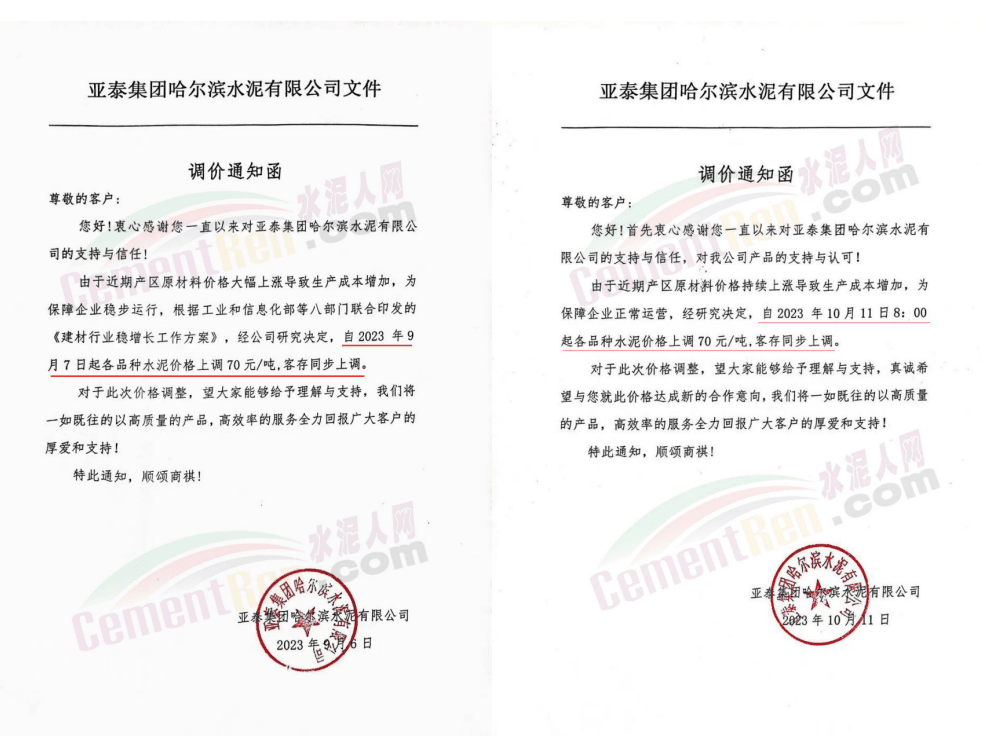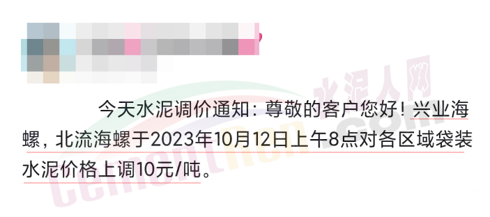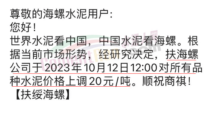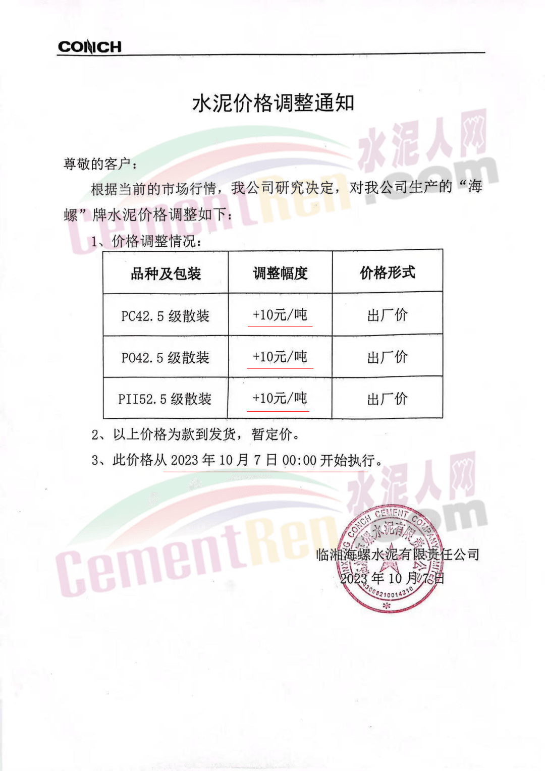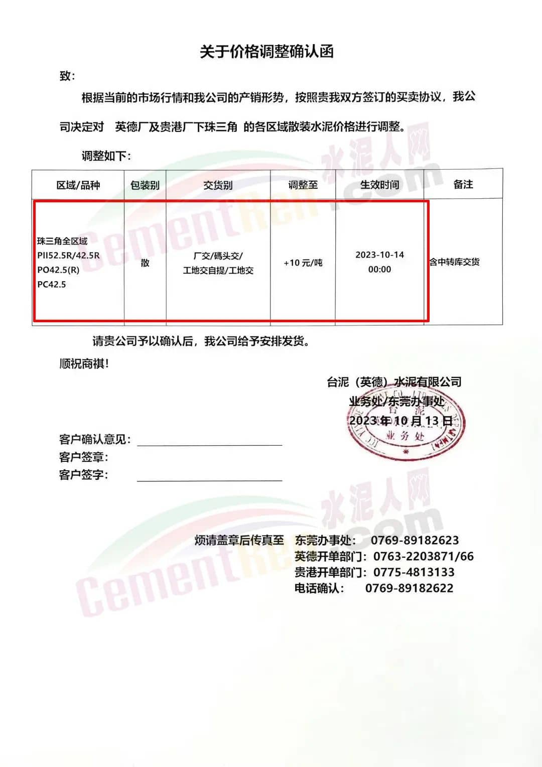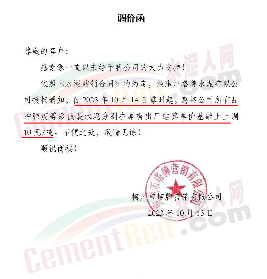 梅州市塔牌營(yíng)銷(xiāo)有限公司通知,經(jīng)惠州塔牌水泥有限公司授權(quán)通知,自2023年10月14日零時(shí)起,惠塔公司所有品種強(qiáng)度等級(jí)散裝水泥分別在原有出廠(chǎng)結(jié)算單價(jià)基礎(chǔ)上上調(diào)10元/噸。