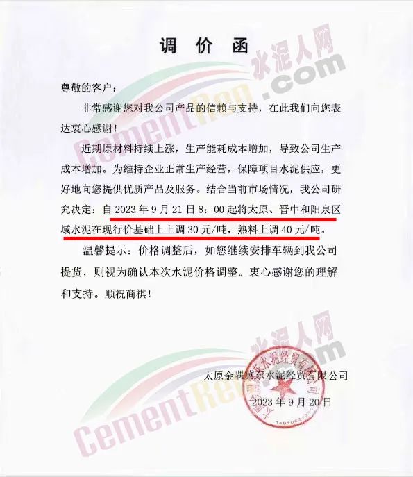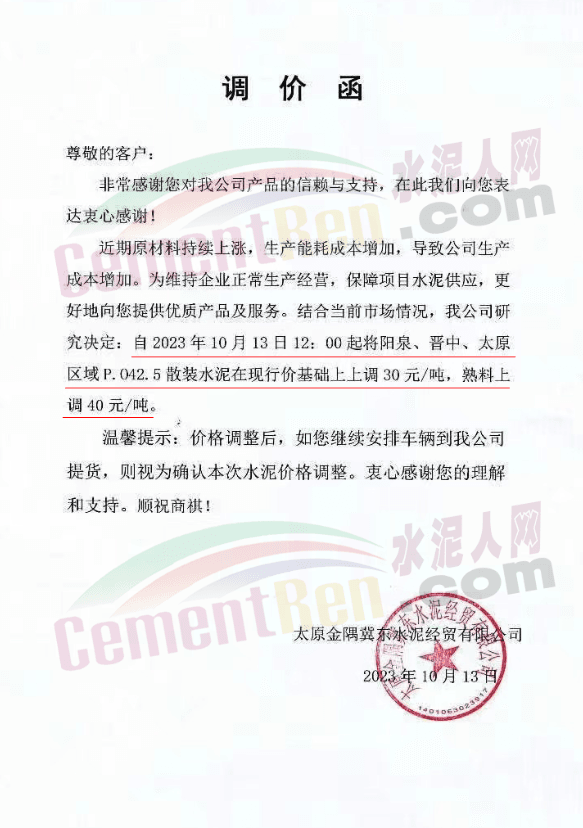 日前,山西太原金隅冀東水泥經(jīng)貿(mào)有限公司通知稱(chēng),近期原材料持續(xù)上漲,生產(chǎn)能耗成本增加,導(dǎo)致公司生產(chǎn)成本增加。為維持企業(yè)正常生產(chǎn)經(jīng)營(yíng),結(jié)合當(dāng)前市場(chǎng)情況,公司研究決定,自2023年10月13日08:00起將左權(quán)公司全品種水泥在現(xiàn)行價(jià)基礎(chǔ)上上調(diào)50元/噸,熟料上調(diào)40元/噸。自12時(shí)起將陽(yáng)泉、晉中太原區(qū)域PO425散裝水泥在現(xiàn)行價(jià)基礎(chǔ)上上調(diào)30元/噸,熟料上調(diào)40元/噸。