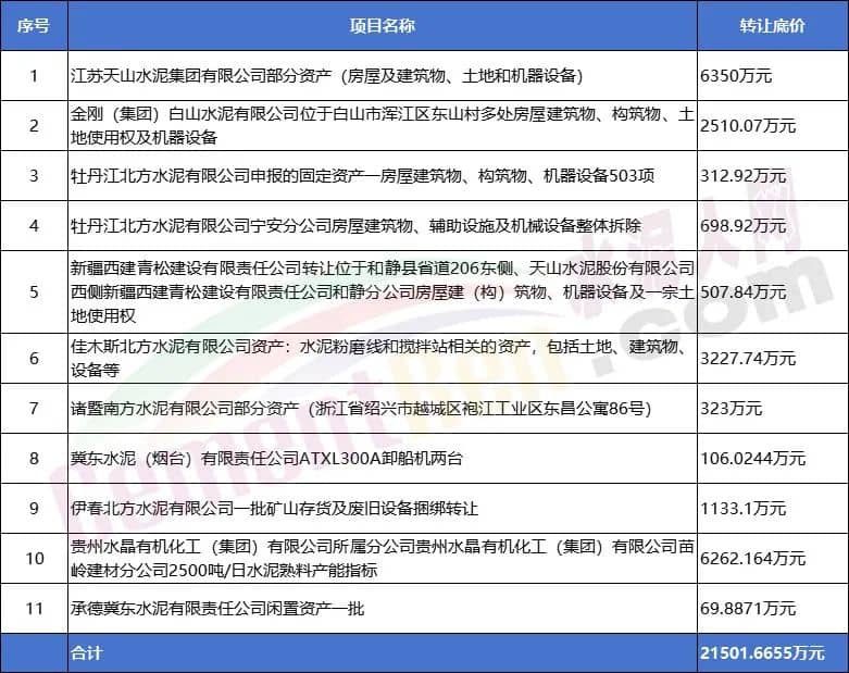 據(jù)查詢,截至目前正在披露的11個水泥廠相關轉讓項目中包含房屋、建筑物、土地使用權、機器設備、熟料產(chǎn)能指標、股權、債權等,轉讓底價合計2.15億。正在披露中的項目,除股權、債權外,多為企業(yè)廢舊資源及低效資產(chǎn)。