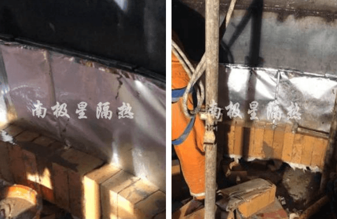 施工中,35mm納米隔熱板分兩層施工,一層25mm粘貼于鋼殼上,然后施工10mm的隔熱氈,兩層隔熱板錯(cuò)縫施工。采用35mm納米隔熱板代替100mm的硅酸鈣板,內(nèi)部直徑增加130mm,容積增加了32立方米,外殼溫度由原來的120℃下降到80℃,降溫幅度為40℃,擴(kuò)容和節(jié)能效果明顯,同時(shí)50天就收回了投資。