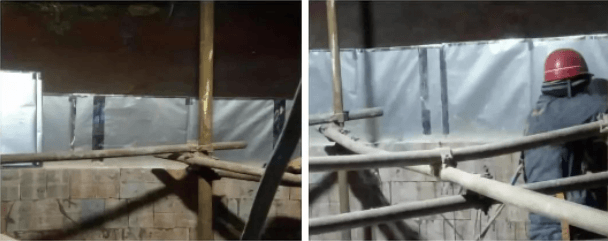 施工中,25mm納米隔熱板分兩層施工,一層15mm隔熱氈粘貼于鋼殼上,然后施工10mm的隔熱氈,兩層隔熱板錯(cuò)縫施工。采用25mm納米隔熱板代替80mm的硅酸鈣板,內(nèi)部直徑增加110mm,容積增加了44.55立方米,外殼溫度由原來的110℃下降到65℃,降溫幅度為45℃,擴(kuò)容和節(jié)能效果明顯。