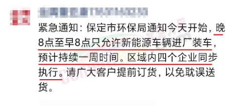 與此同時(shí),河北保定區(qū)域某水泥企業(yè)通知,禁止非新能源車進(jìn)廠。