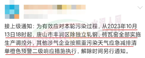 河北唐山區(qū)域通知,涉氣企業(yè)按照重污染天氣應(yīng)急減排清單橙色預(yù)警二級(jí)響應(yīng)措施執(zhí)行。
