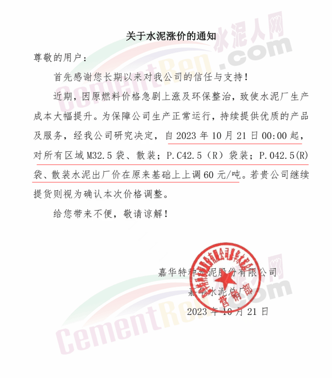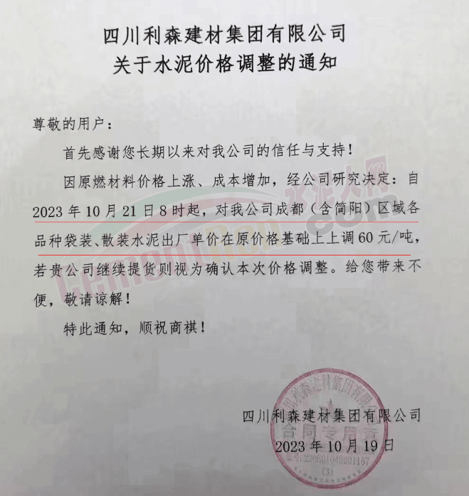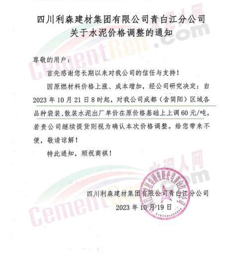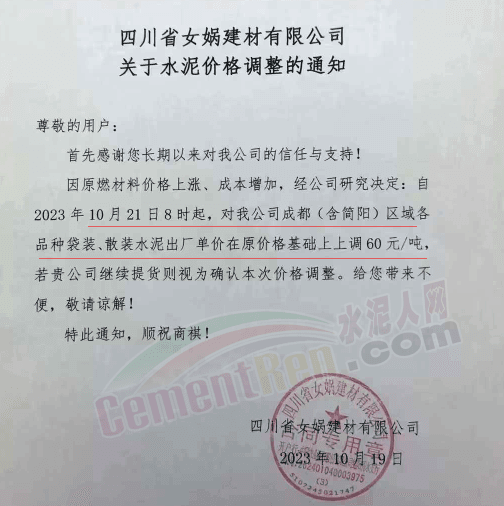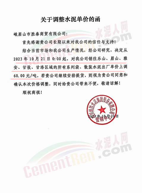 水泥人網通訊員消息:日前,四川大成都區(qū)域主要品牌企業(yè)通知自2023年10月21日起上調各品種水泥出廠價60元/噸。